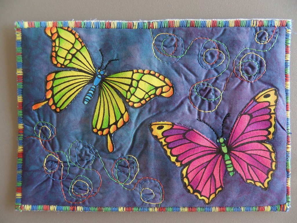 Uit een stof met vlinders heb ik enkele vlinders geknipt en deze met vliesofix op een ondergrond geplakt.