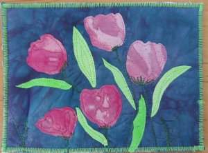 Voor de andere kaart heb ik bloemen en blaadjes geknipt en deze ook met vliesofix op de ondergrond gestreken, verder met quiltsteken versierd.