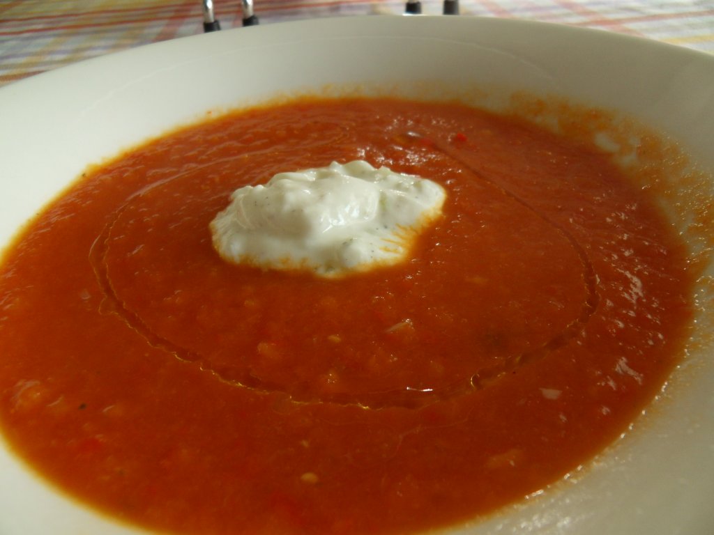 Verhit een eetlepel olijfolie in een pan en voeg een in ringetjes gesneden ui, een halve in stukjes gesneden winterwortel en een in stukjes gesneden rode paprika toe, laat dit ongeveer een kwartier sudderen. Voeg dan twee fijngesneden knoflookteentjes en een fijngesneden rode peper toe, laat even meebakken en doe er dan 400 ml groentebouillon en een half blik tomatenblokjes bij. Breng weer aan de kook en laat nog 10 minuten sudderen. Maak de soep met de staafmixer glad. Meng 2 eetlepels Griekse yoghurt met een stukje geraspte komkommer en peper en zout en serveer de soep met een schep van de yoghurt en een scheutje olijfolie. Als je soep overhebt kan je die de volgende dag koud eten, ook erg lekker.