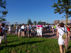 Omdat Aat nog last heeft van zijn achillespees hebben we zaterdag geen tocht gemaakt, maar gelukkig was er gisteren een wandeltocht in Hellevoetsluis voor het goede doel: A Sister’s Hope. Dit is een internationale stichting die geld inzamelt voor borstkankeronderzoek. Je kon 5, 10 of 20 km lopen en samen met Bea heb ik de 20 km gedaan. Het begon om 10.00 uur bij de school Helinium, waar het al gezellig druk was.