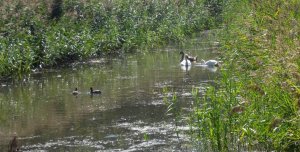 Het was de bedoeling van de organisatie dat alle 3 tochten ongeveer gelijk zouden eindigen, maar wij waren al om half 2 terug en toen moest de 5 km nog starten. We hadden geen zin om zo lang te wachten en zijn gelijk naar huis gegaan, ik weet dus niet wat de totale opbrengst is. Vlakbij de finish zagen we deze zwanen en eenden zwemmen.