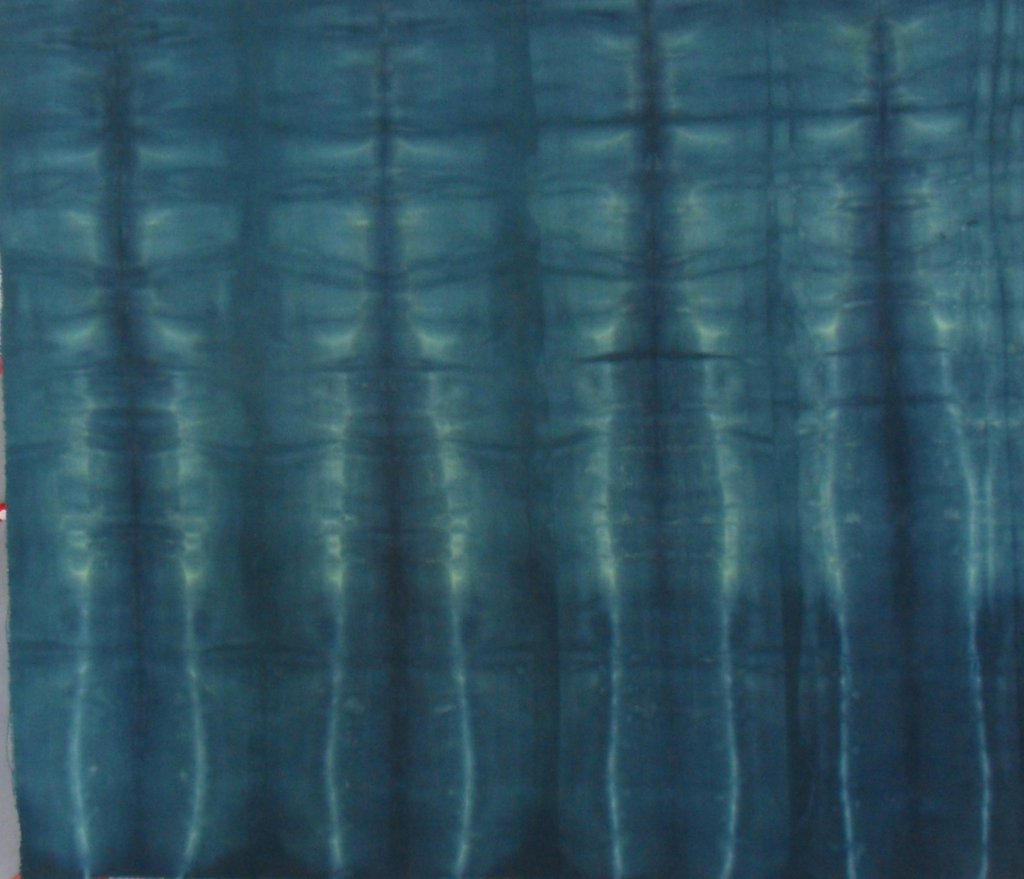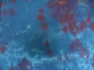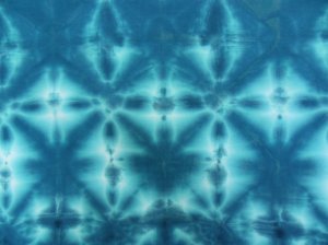 Ik heb wat zitten experimenteren met verven door lapjes op verschillende manieren te vouwen en er daarna een elastiekje om te doen. Omdat ik niet zeker van het resultaat was heb ik hiervoor stukken van een oud laken gebruikt, maar de uitkomst is zodanig dat ik het volgende keer wel met goede stof kan doen.