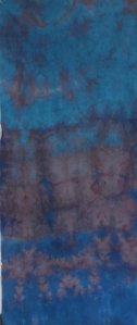 Bij de volgende lap heb ik eerst wat verf in een potje gedaan, daarin een deel van de lap gepropt, toen een andere kleur over het volgende stuk van de lap en tenslotte een derde kleur over het laatste deel, waarbij de kleuren mooi in elkaar overlopen.