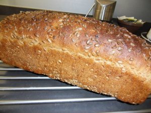 Gistermiddag heb ik een zonnebloempittenbrood gebakken, gewoon op de ouderwetse manier, Aat bakt regelmatig een brood in de broodbakmachine, maar deze keer heb ik het in de oven gebakken in een broodbakblik. Ik vond het best een tijdrovend karwei, je moet het deeg diverse malen laten rijzen, maar het resultaat is echt heerlijk en het ziet er mooi uit, ik ben er best wel een beetje trots op. Het recept heb ik van Levine.