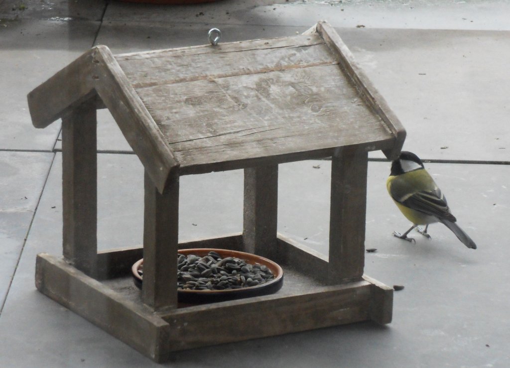 Zaterdag hebben we de voedersilo opgehangen en wat voer in het vogelhuisje gelegd en het hele weekend hebben we genoten van de koolmeesjes en andere vogeltjes, af en aan vliegen ze, soms wel met 4 tegelijk, een leuk gezicht.