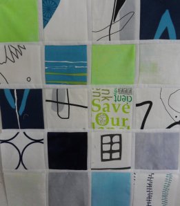Verder ben ik bezig met een klein werkje voor tussendoor naar een voorbeeld uit het boek “Quilting line + color” van Yoshiko Jinzenji met stoffen met veel wit erin, afgewisseld met gekleurde blokjes.