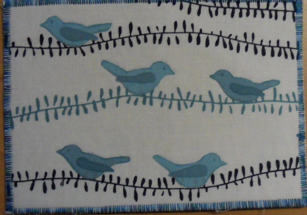 De vogeltjes heb ik uit stof geknipt en op een ander stofje geplakt, net of ze ergens op zitten.