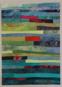 Het “testquiltje” is af, ik heb het afgewerkt met een onzichtbare bies en lekker in het zonnetje (wel achter glas) met de hand tegengezoomd. Heerlijk weer, mijn verkoudheid is gelukkig ook weer bijna voorbij. Aart vroeg hoe dik de vulling is, het is ongeveer even dik als de Hobbs 80/20.