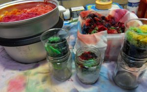 ging het weer kriebelen, zal ik wel, zal ik niet… En ja, ik ben toch weer gezwicht voor sneeuwverven. Niet teveel lapjes en op verschillende manieren, bij de één eerst de verfoplossing door de sneeuw gemengd en bij de ander eerst de sneeuw erop en daarna de verfoplossing, ik ben benieuwd.