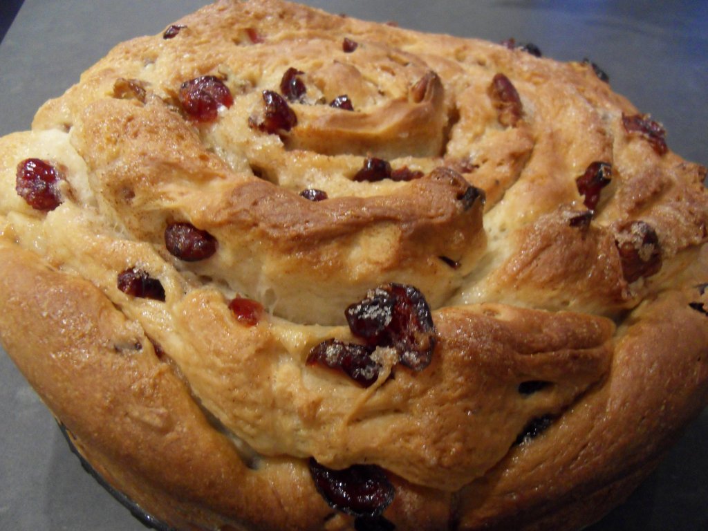 Het is een heerlijk zoet brood met cranberries en pecannoten, het deeg was genoeg voor twee broden maar je kan het gelukkig goed invriezen. Hier kan je het recept vinden. Op het laatst moest je het nog met eigeel en melk bestrijken, dat was ik vergeten maar de smaak was er niet minder om, echt een heel lekker brood.