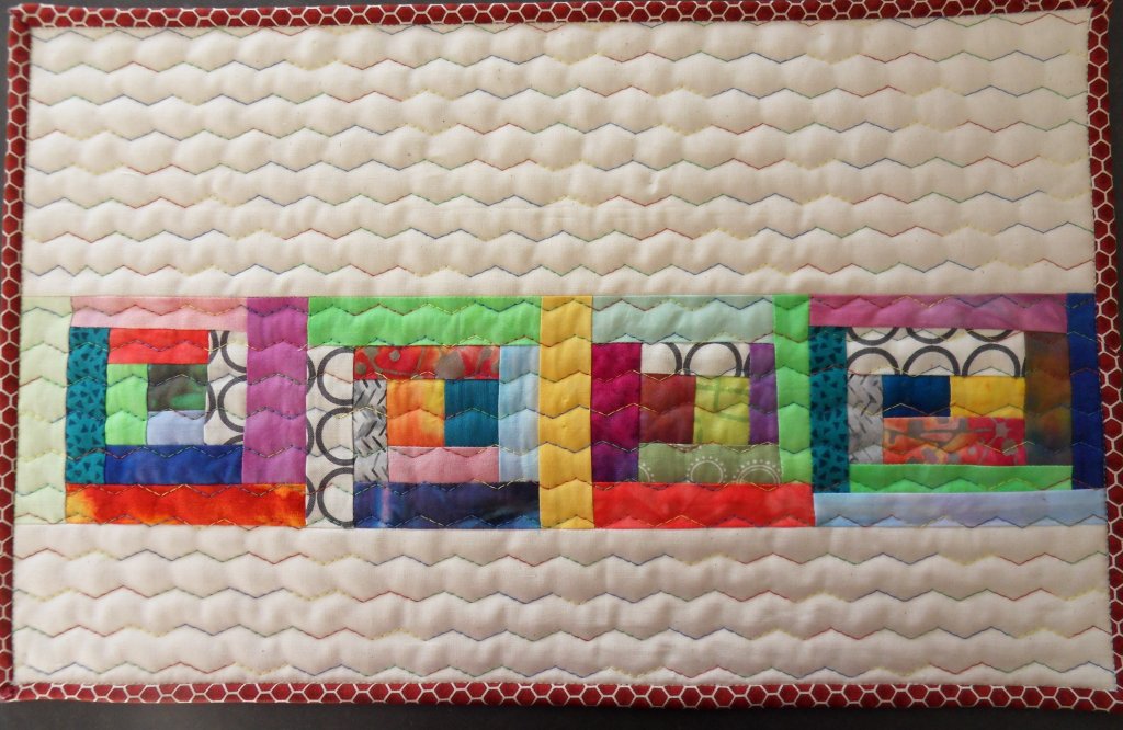 Van kleine restjes log cabin blokken gemaakt en het geheel doorgequilt met een zigzagpatroon wat ik op de site van Amandajean zag. Deze keer heb ik de bies er helemaal machinaal aangezet volgens de methode van Rita van Redpepperquilts.