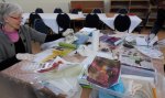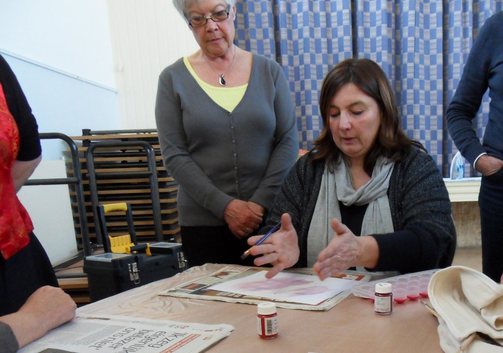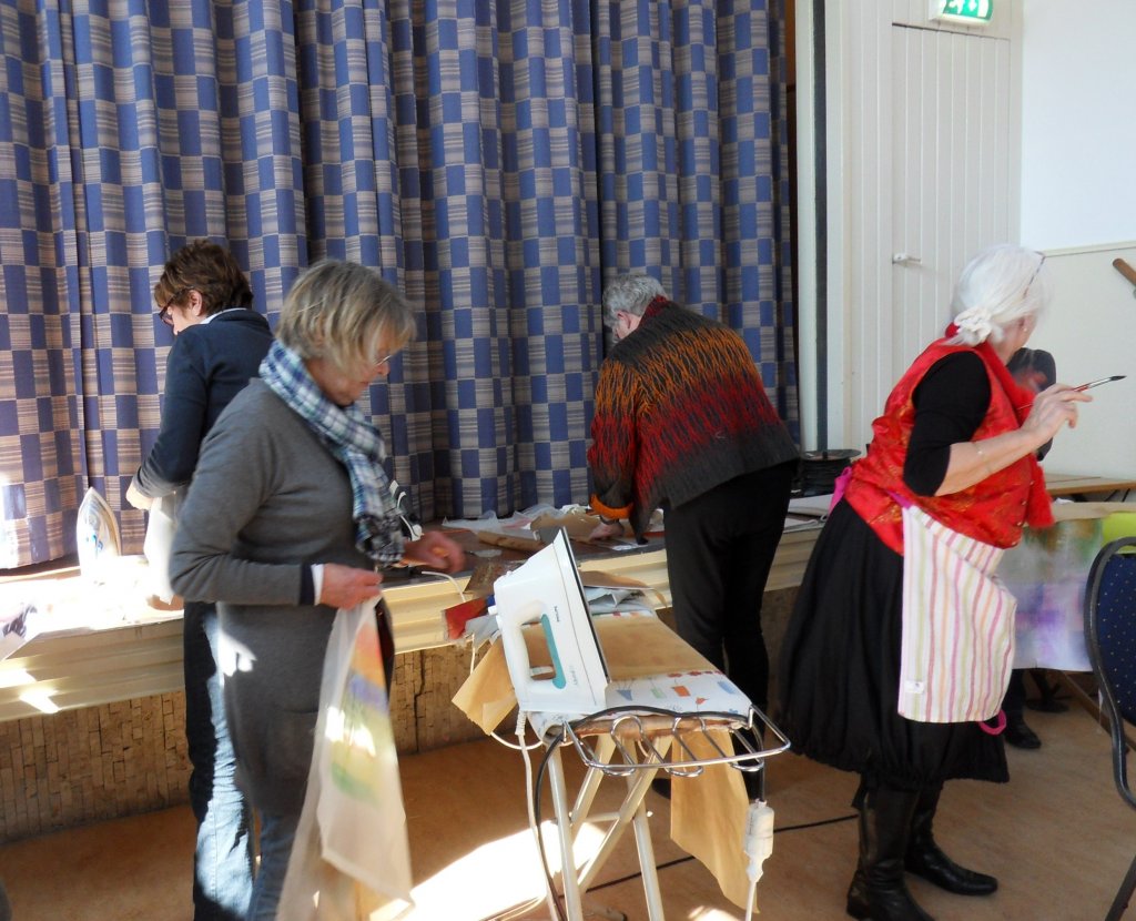 Al gauw was iedereen druk in de weer met verf en papier, na droging kon de verf door middel van strijken op de lapjes overgebracht worden.