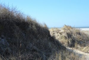 Op het strand was bijna niemand, we konden niet door de duinen lopen vanwege het broedseizoen, dus liepen we in de volle wind.