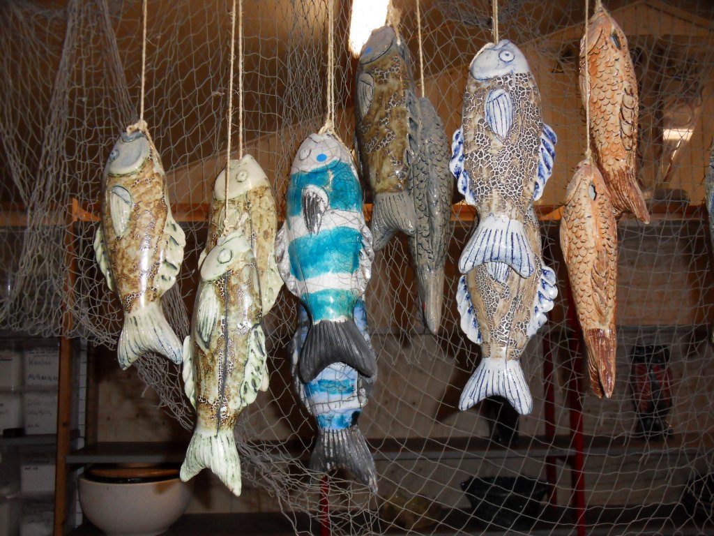 De tocht was goed georganiseerd met 2 rusten waar gratis thee en koffie was. Bij de eerste rust was een pottenbakkerij en er stond en hing van alles, o.a. deze leuke vissen.