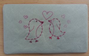 Broer Dirk is 35 jaar getrouwd met Willy en dat vierden ze gisteren. Na een wandeltocht bij Rotterdam-Ommoord zijn we gelijk doorgereden naar Hoofddorp, gelukkig konden we ons daar even opfrissen en omkleden. Moeilijk om een cadeau te verzinnen dus werd het een envelopje met inhoud, de envelop heb ik zelf gemaakt van een lapje. 2 vogeltjes met hartjes met transferverf erop gezet en hier en daar wat borduursteekjes.