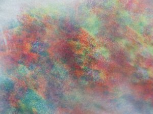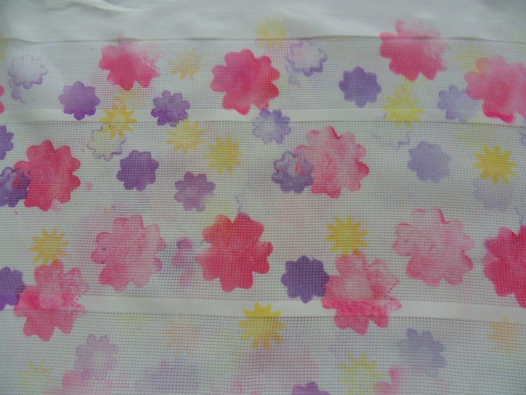 Bij de eerste heb ik verschillende kleuren verf met een stukje spons op het papier gedept, het resultaat op de stof is wel grappig.