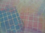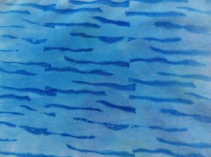Bij de laatste heb ik de stof eerst met een effen vel blauw geverfd en toen met een gestempeld vel nog eens, het lijkt net water.