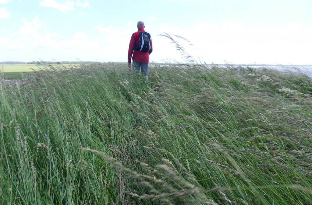 Onderweg was nog een stempelpost en daar kon je kiezen of je via de dijk verder ging of beneden langs over de weg. Wij kozen voor de dijk waar het gras flink hoog stond, dus dat was ploeteren maar wel leuk.