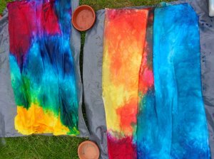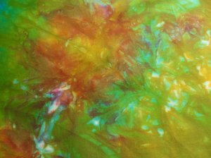 Met het mooie weer van de afgelopen dagen moest er toch weer geverfd worden. Deze keer heb ik drie natte lappen op elkaar op een vuilniszak gelegd en hier diverse kleuren verfoplossing over gegoten. Dit lekker in het zonnetje gelegd, later heb ik er wel plastic over gedaan omdat het anders te snel zou drogen.