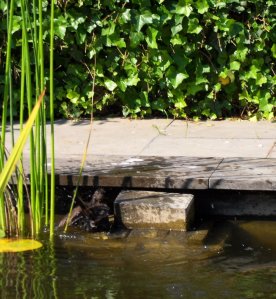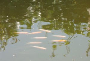 We hadden vorig jaar een flink aantal goudwindes en blauwe windes in de vijver, maar ze hebben de winter niet allemaal overleefd. Wel hebben ze voor nageslacht gezorgd, we hebben nu zo’n 10 tot 12 kleine visjes en nog 2 of 3 grote.