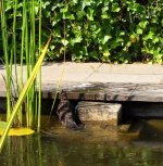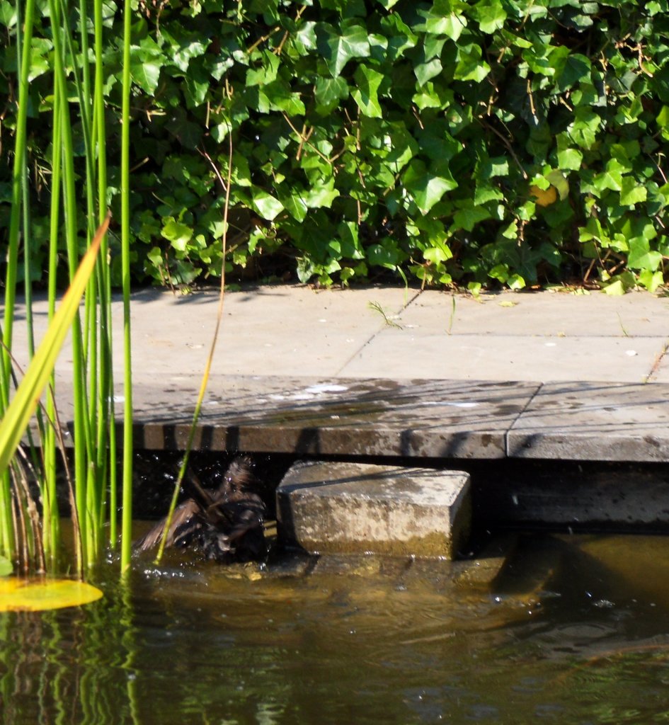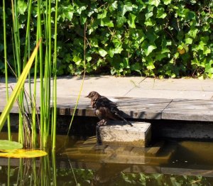 In de warmte komt er regelmatig een vogel spetteren in de vijver, hij kan dan op het kikkertrapje zitten. Nee, we hebben geen kikkers dit jaar, vorig jaar zaten er juist behoorlijk veel, waar ze gebleven zijn weet ik niet.
