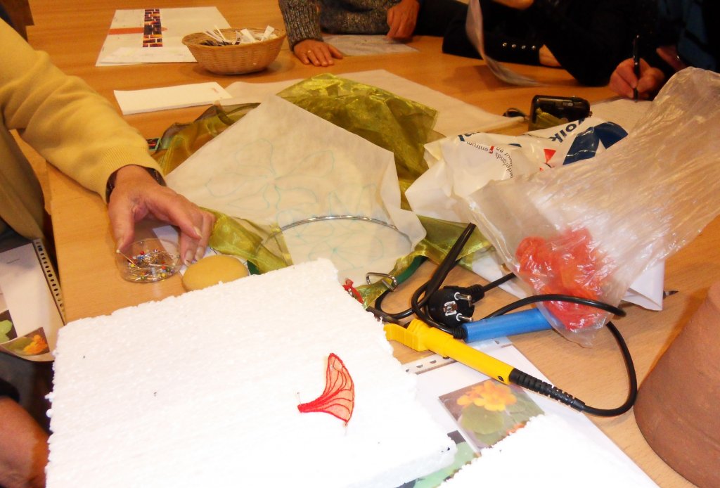 Het was een gezellige dag, iedereen had weer wat lekkers meegebracht voor het eten zodat we niets tekort kwamen. Aan het eind nog een korte demonstratie van Sary hoe je kan werken met waterverdwijnvlies om 3D figuren, b.v. bloemetjes, aan te brengen op je quilts.