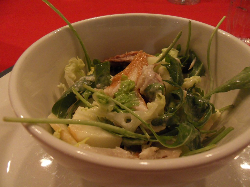 100 gram rucola, 1 kropje little gem fijngesneden, 1Granny Smith appel in dunne reepjes, sap van 1/2 citroen, 2 gerookte makreelfilets. Dressing: 3 el karnemelk, 2 el mayonaise, 1 el mierikswortel, 1 gesnipperd lente-uitje, 2 el lekkere olijfolie, zouten peper. Klop alles voor de dressing door elkaar. Meng de rucola met de little gem. Besprenkel de appel met het citroensap, maak de makreelfilets fijn en schep alles door elkaar. Schep de dressing erover en serveer in mooie schaaltjes. Lekker met geroosterd stokbrood.