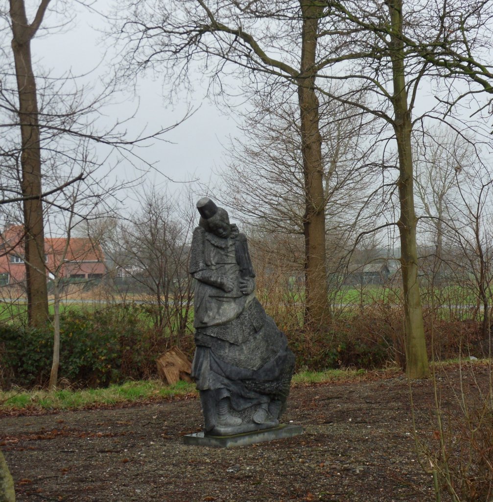 Bij een boerderij stonden allemaal beelden in de tuin.