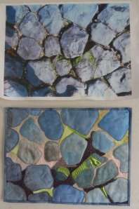 Sommige stenen heb ik met verf ingevuld, andere met stof, de aarde tussen de stenen met organza in verschillende laagjes.