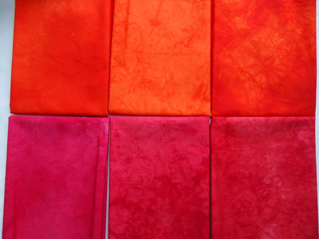 Omdat ik weinig rode lapjes meer heb besloot ik te gaan experimenteren met verschillende soorten verf en verschillende manieren om te verven. Ik had scarlet en magenta van Drimarene-K gekocht bij mijn-eigen en citrien, barnsteen, onyx en rose toermalijn Procion-MX bij stof tot verven. Het zijn allebei reactieve verven en worden op dezelfde manier gebruikt, alleen heeft de Drimarene grotere korrels en stuift dus minder. Ik ben begonnen met diverse verfoplossingen te maken, 10 gram poeder op 100 ml water. Toen heb ik 21 fat eights gescheurd en 3 series geverfd met dezelfde kleuren.