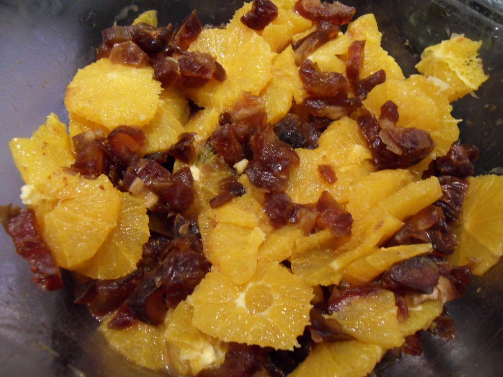 Schil voor dit laatste gerecht 6 sinaasappels dik, zodat ook het wit eraf is en snijd de sinaasappels in dunne plakken. Schil de sinaasappels boven de schaal zodat het sap opgevangen wordt. Verwijder de pitten van 12 dadels en snijd deze in kleine reepjes. Meng alles in een grote schaal met een theelepel kaneel en laat dit een tijdje goed intrekken.