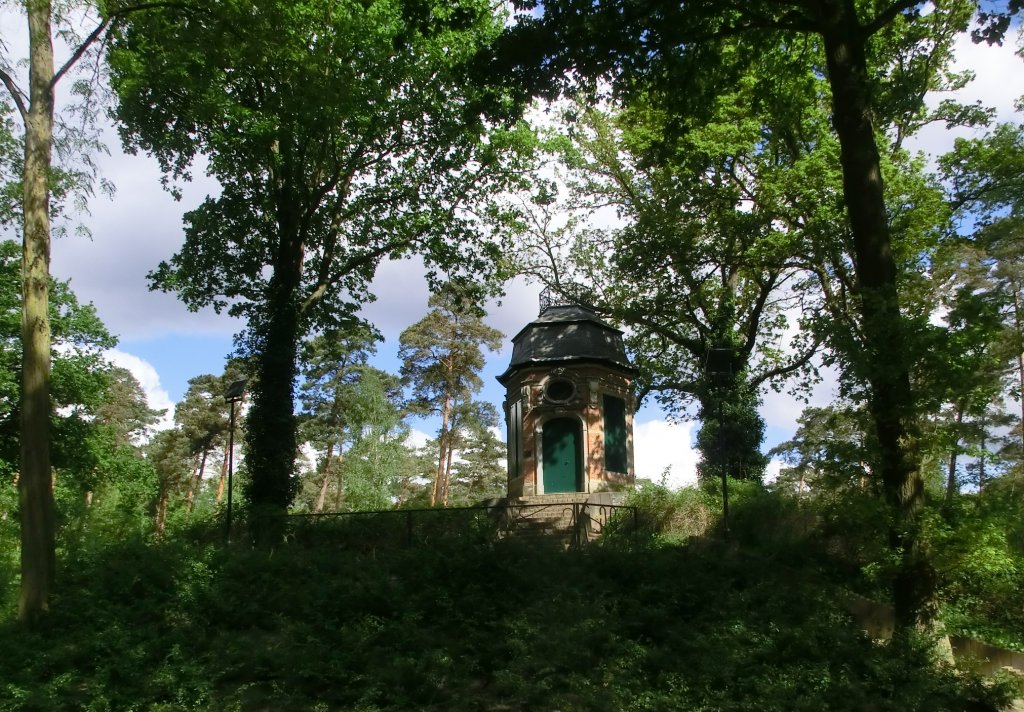 Hier zie je Kasteel Ravenhof door de bomen heen.