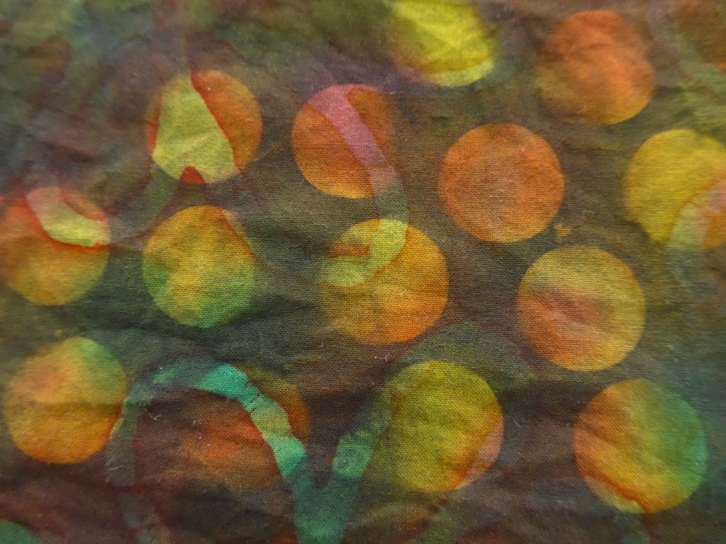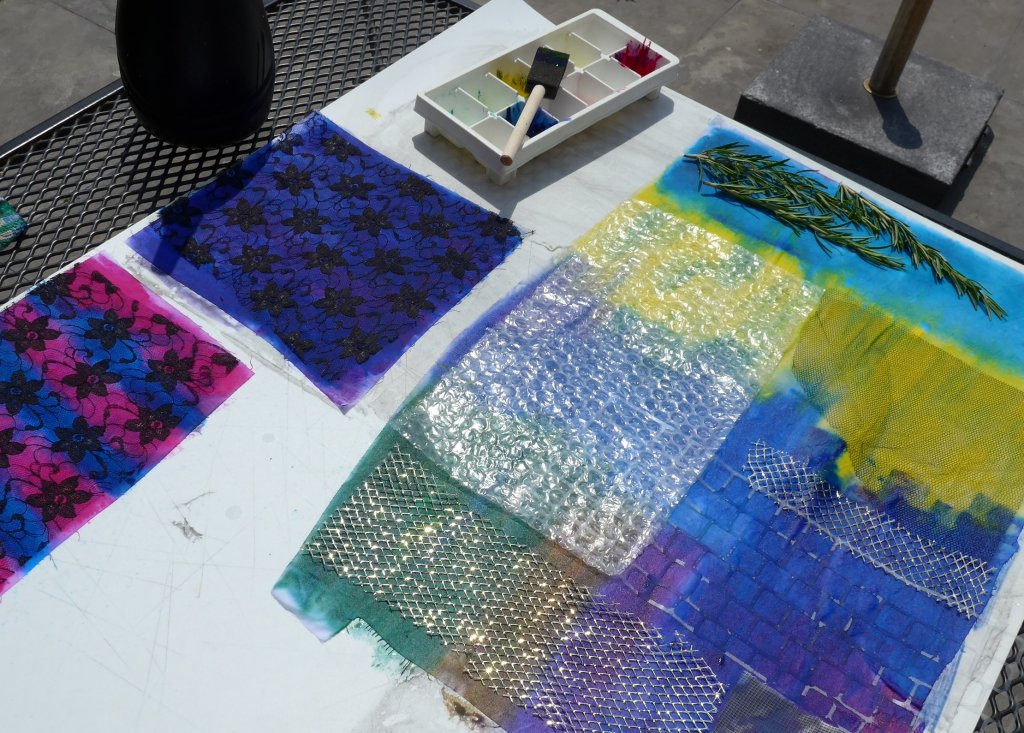 Vervolgens heb ik wat witte lappen ingesmeerd met diverse kleuren verf en hier weer allerlei voorwerpen opgelegd, o.a. kant en vitrage.
