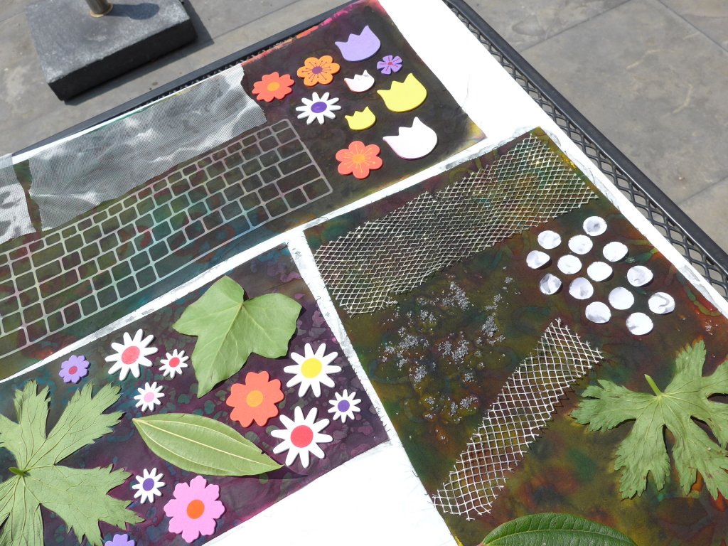 Omdat het al een paar dagen behoorlijk warm en zonnig is besloot ik me nog eens te wagen aan sun printing. Ik heb eerst een paar felgekleurde prints met zwarte verf bestreken en hier allerlei voorwerpen op gelegd.