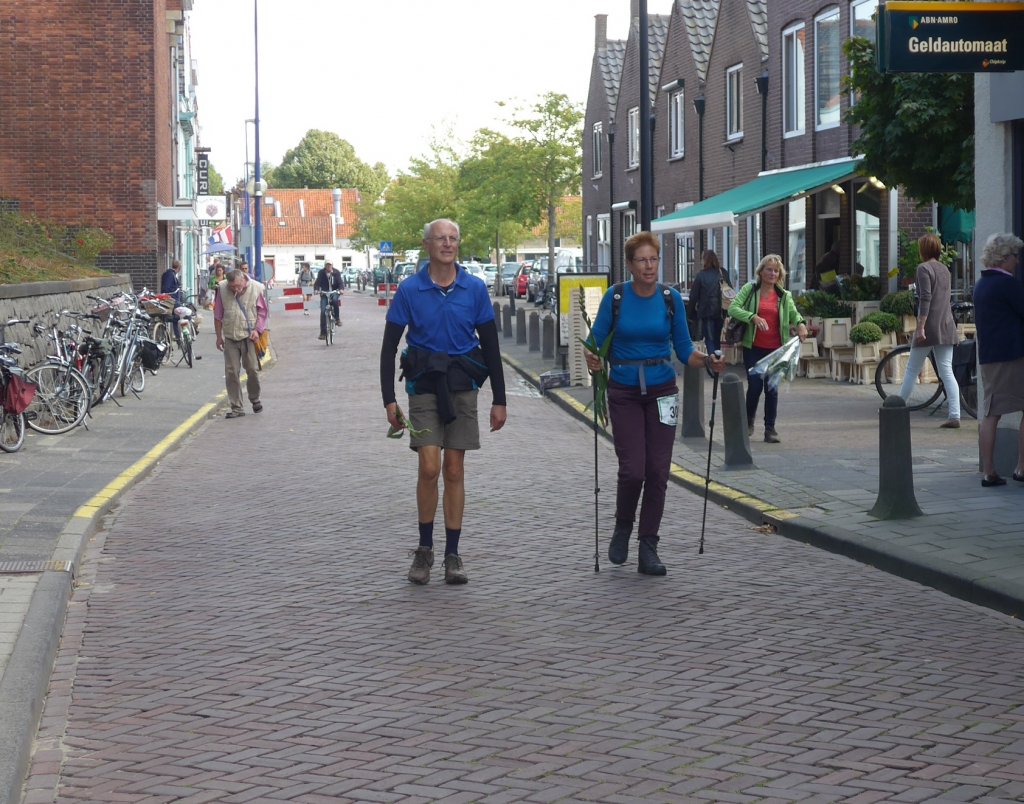 Vannacht heeft hij diverse flinke buien meegemaakt en ook vanmorgen nog, gelukkig duurden ze niet al te lang en hij kwam met mooi weer bij de finish aan. Finishtijd: 15.17 uur, een uur vroeger dan vorig jaar, ik vind het geweldig knap. Vanaf Stellendam liep hij samen met Willy, hier zijn ze bijna bij de finish.