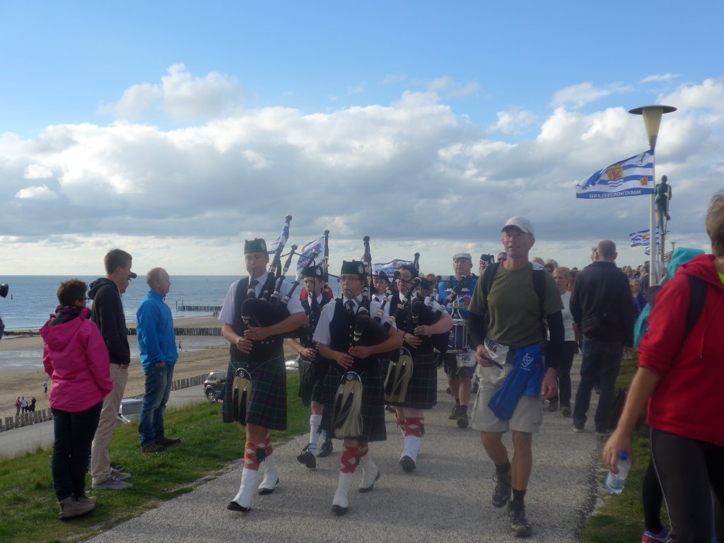 Een groepje doedelzakspelers liep een eindje voor hen uit.