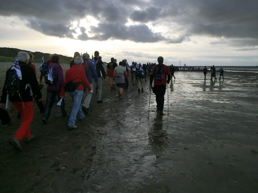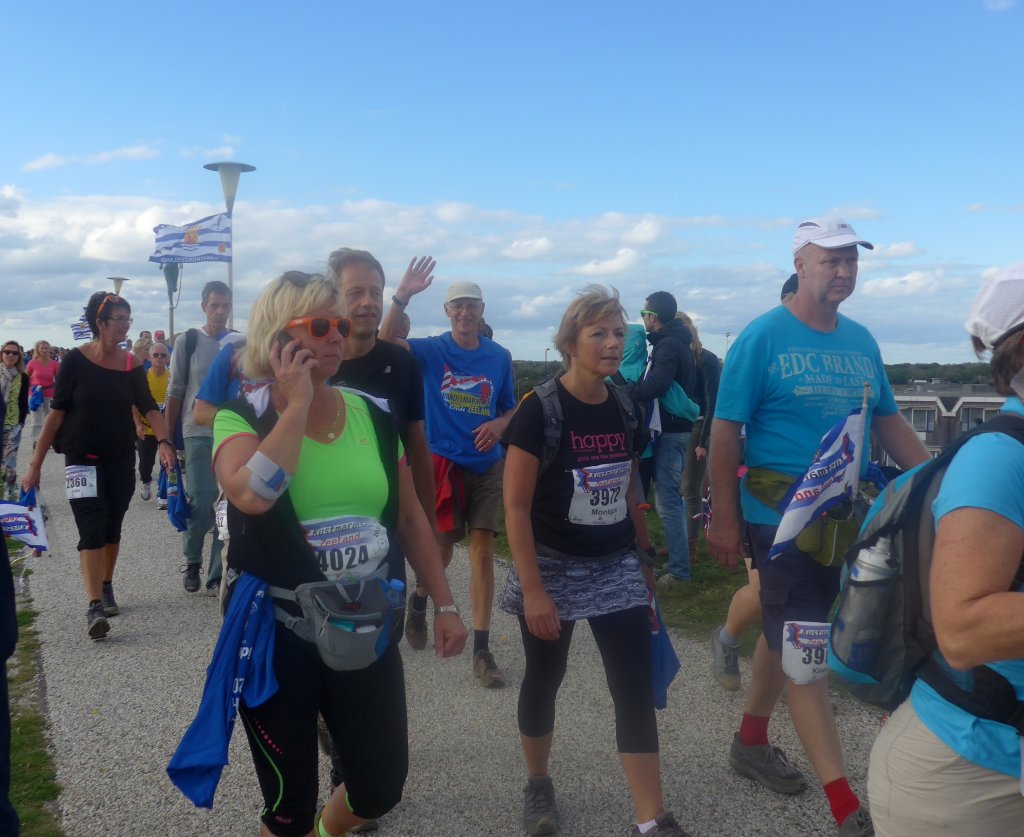 Ze liepen over de Pijlerdam, langs Neeltje Jans en de Veerse Dam naar Walcheren, natuurlijk veel over het strand en door de duinen. Rond 5 uur waren ze in Zoutelande waar het een gezellige drukte was.