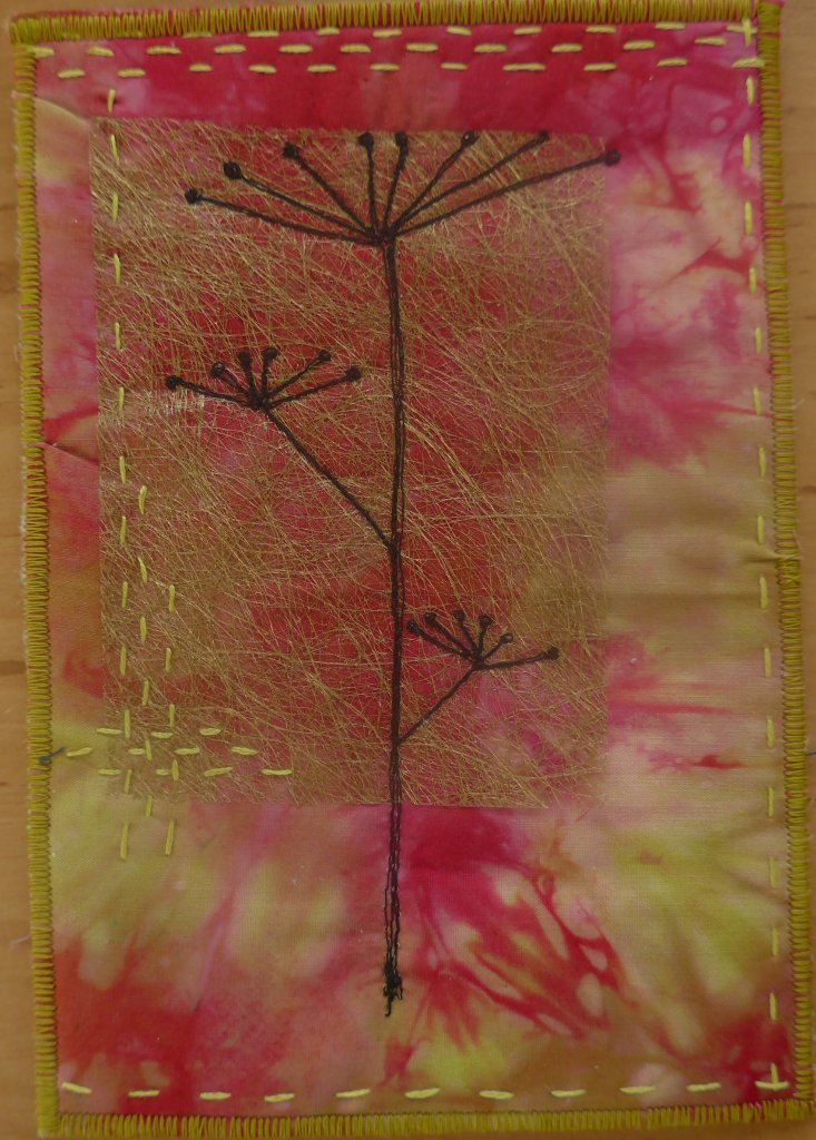 Er komen weer een paar verjaardagen aan, dus heb ik alvast wat kaarten gemaakt. Deze keer heb ik een geverfd lapje en een stukje tussenvulling op elkaar gelegd, een tekeningetje op dun papier gemaakt, dit op de achterkant (dus op de tussenvulling) gespeld en toen machinaal doorgestikt. Daarna de kaart nog verder versierd.
