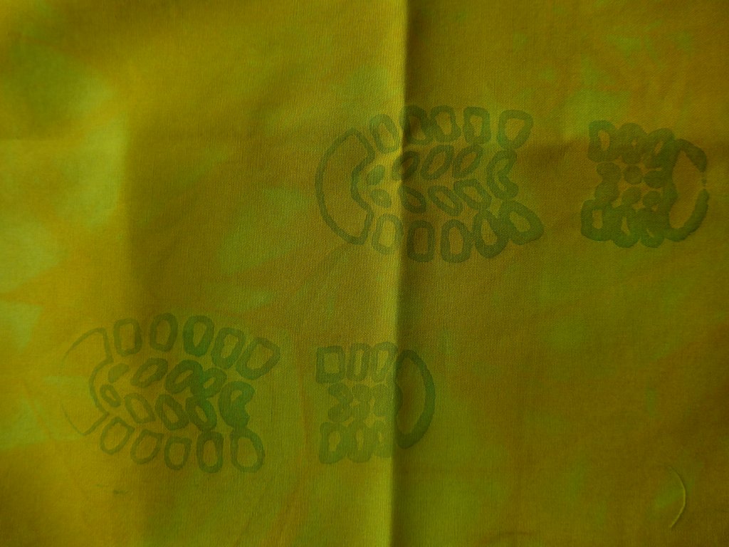 Ik heb wel geleerd dat het contrast groter is als je de verf flink verdunt, dus niet te donker en het is ook beter om meer te roeren en kneden zodat er minder tekening in de stof zit, dan komen de figuren wat duidelijker uit.