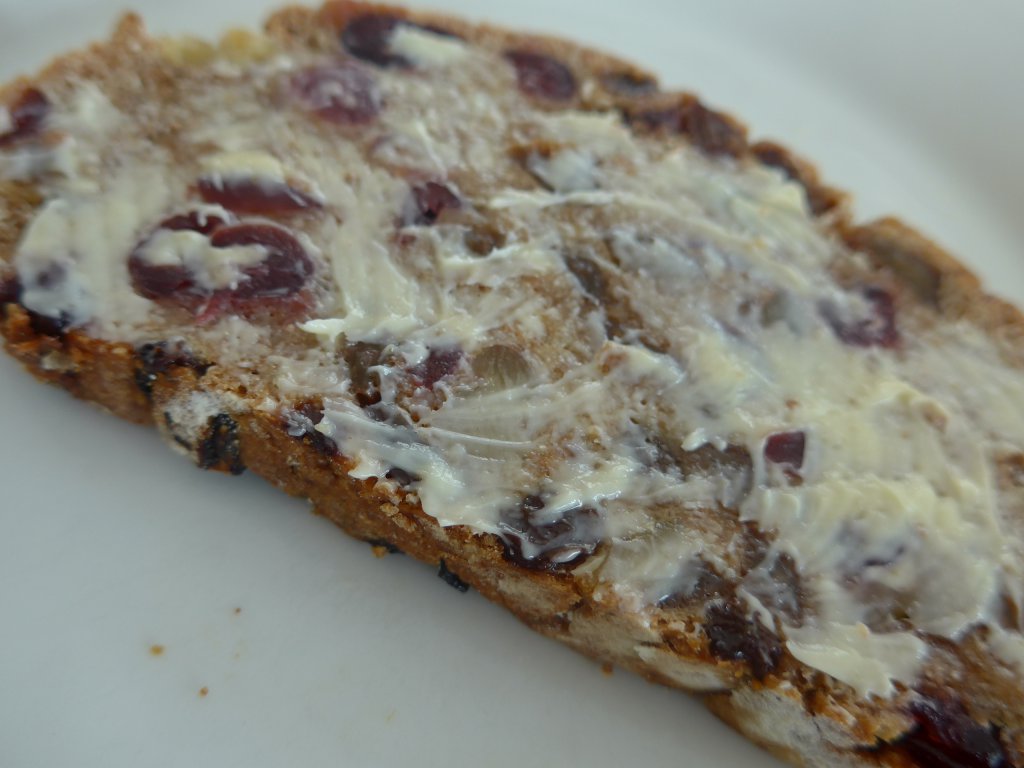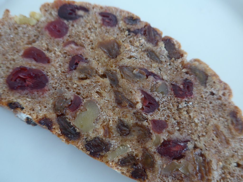 500 gram speltmeel, 315 gram lauw water, 7 gram droge gist, 10 gram zout en 400 gram rozijnen. Ik heb half rozijnen/half cranberries gebruikt en er ook nog wat gehakte noten doorgedaan. Iets minder rozijnen zou wel kunnen, het broodje zat wel erg vol: