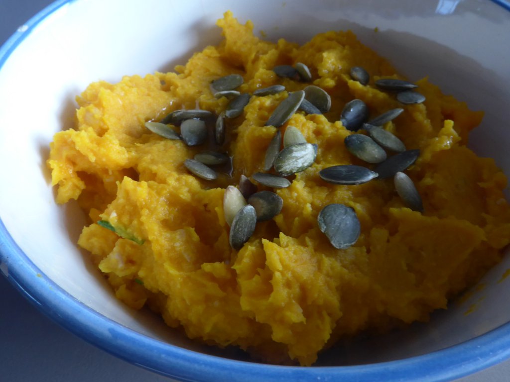 Kook eerst de stukjes pompoen in 10 minuten gaar. Doe ze daarna met de overige ingrediënten in een blender of pureer ze met de staafmixer. Proef of er nog wat zout of kruiden bij moet. De hummus is heerlijk op zelfgemaakte pitachips of een toastje of gewoon op een boterham, eventueel aangevuld met wat tomaat of komkommer. Voor de pitachips heb ik een volkoren pitabroodje doorgesneden zodat ik twee rondjes had en elk deel in 6 driehoekjes gesneden. Meng wat citroensap met olijfolie en chilipoeder en eventueel wat zout en haal hier de driehoekjes door. Leg ze op een met bakpapier bekleedde bakplaat en schuif ze ongeveer 12 minuten in een op 180 graden voorverwarmde oven. Na het afkoelen worden ze heerlijk knapperig. Ze zijn zo ook al erg lekker maar met de pompoenhummus erop blijf je ervan eten!
