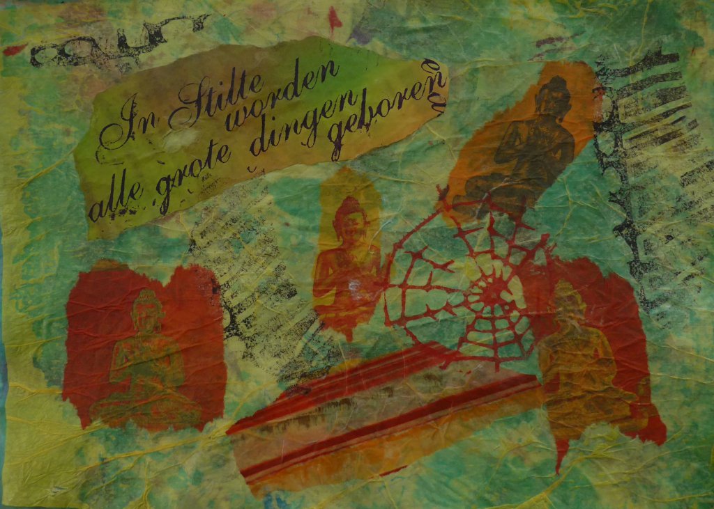 Agnes had tissuepapier in allerlei kleuren meegebracht en lintjes, glitters, verf enz. die we mochten gebruiken. Zeker iets om thuis mee verder te gaan.
