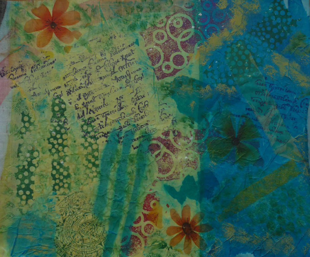 Gisteren gaf Agnes, een van de leden van onze quiltgroep, een workshop over fabric paper. We hebben heerlijk zitten fröbelen met stof, papier, lijm en verf. Het resultaat zijn vrolijke stukken waar je gewoon doorheen kan stikken en waarvan je b.v. kaarten kan maken of een omslag voor een notitieboekje. Ik vond het erg leuk om te doen, dit heb ik gisteren gemaakt: