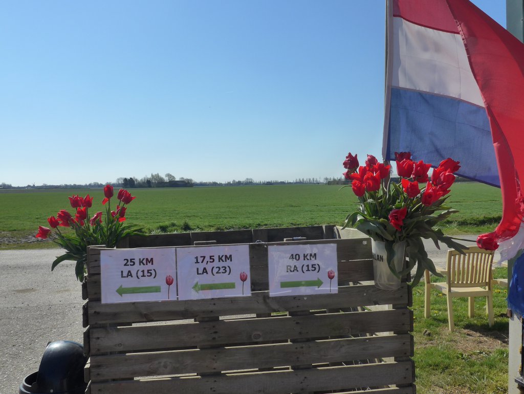 Hier stonden vrijwilligers met koffie en thee en kon je naar het toilet. Daarna maakten we een mooie slinger richting Dirksland en toen weer terug langs diverse tulpenvelden op weg naar de tweede rust, deze was bij de boerderij van Arie Wesdorp. Ook hier kregen we weer koffie of thee met koek en ook mochten we een appeltje meenemen voor onderweg.