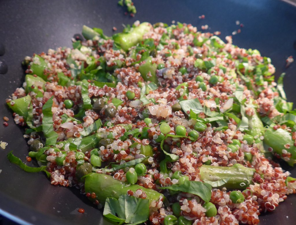 Vandaag weer eens een recept. Het is nu aspergetijd, maar eerlijk gezegd ben ik niet zo’n fan van witte asperges. Wel van groene, die vind ik altijd heerlijk om b.v. te roerbakken. Deze keer heb ik ze gebruikt in combinatie met quinoa en gegrilde zalmfilet.