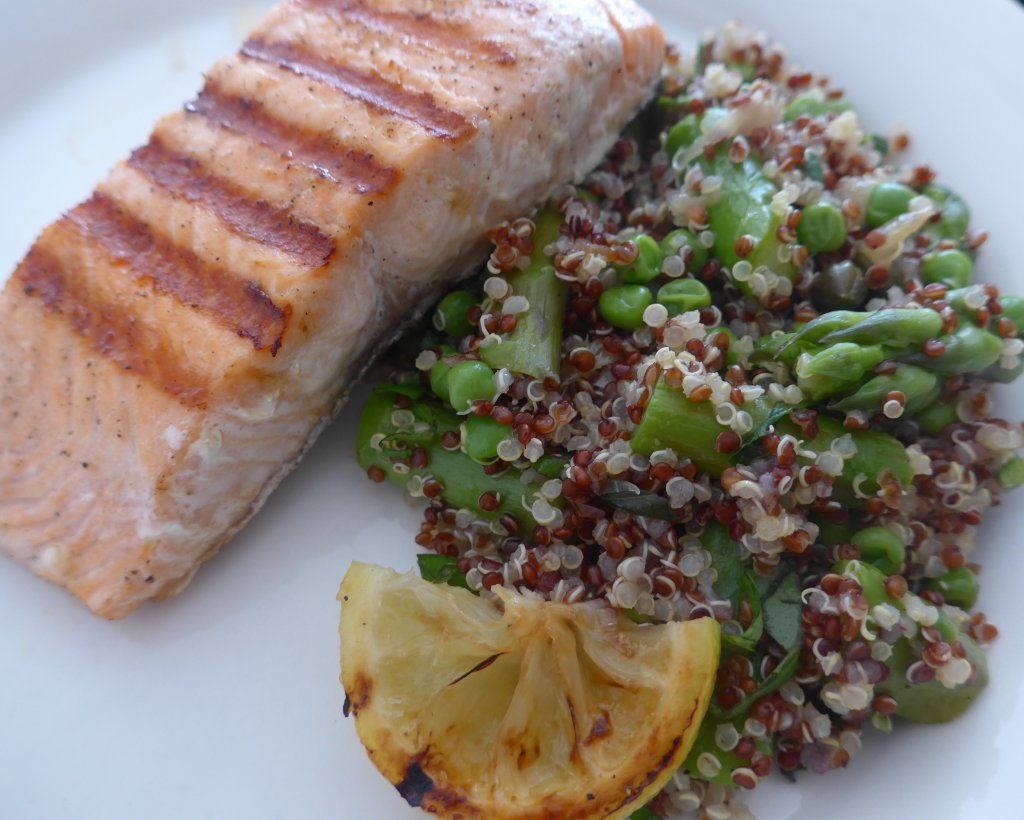 Kook eerst de quinoa gaar volgens de gebruiksaanwijzing op het pak. Ik had Green Age quinoa, eerst goed afspoelen en dan in 300 ml kokend water in 12 minuten garen. Verhit intussen de kokosolie en fruit het gesnipperde uitje en knoflook. Snijd ongeveer 2 cm van de groene asperges en kook ze in 8 minuten gaar, kook de doperwtjes 6 minuten. Voeg de geraspte citroenschil en wat peper en zout toe aan de uit met knoflook, dan de gare quinoa. Snijd de asperges in stukken en voeg deze met de doperwtjes ook toe. Wrijf de zalmfilet in met zout en peper en wat olijfolie en grill hem eerst 3 minuten op de huid in de grillpan en daarna nog eens 3 minuten aan de andere kant. Maak de quinoa op smaak met citroensap, kleingesneden basilicum en kappertjes. Je kan ook een halve citroen in de grillpan doen en hiervan het sap gebruiken.