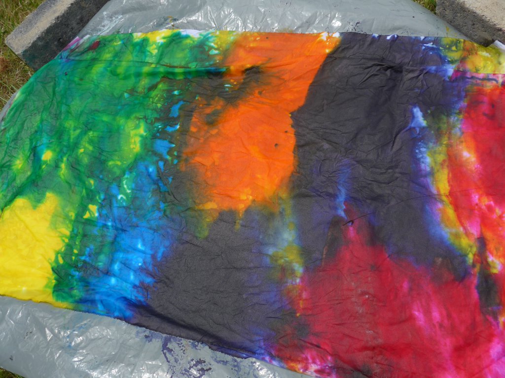 Gisteren scheen het zonnetje en dan begint het weer te kriebelen, ik krijg dan zin om lapjes te gaan verven. Deze keer heb ik wat lappen op elkaar op een plastic zak gelegd en er verf over gegoten, ook heb ik nog wat lapjes in bakken gedaan.