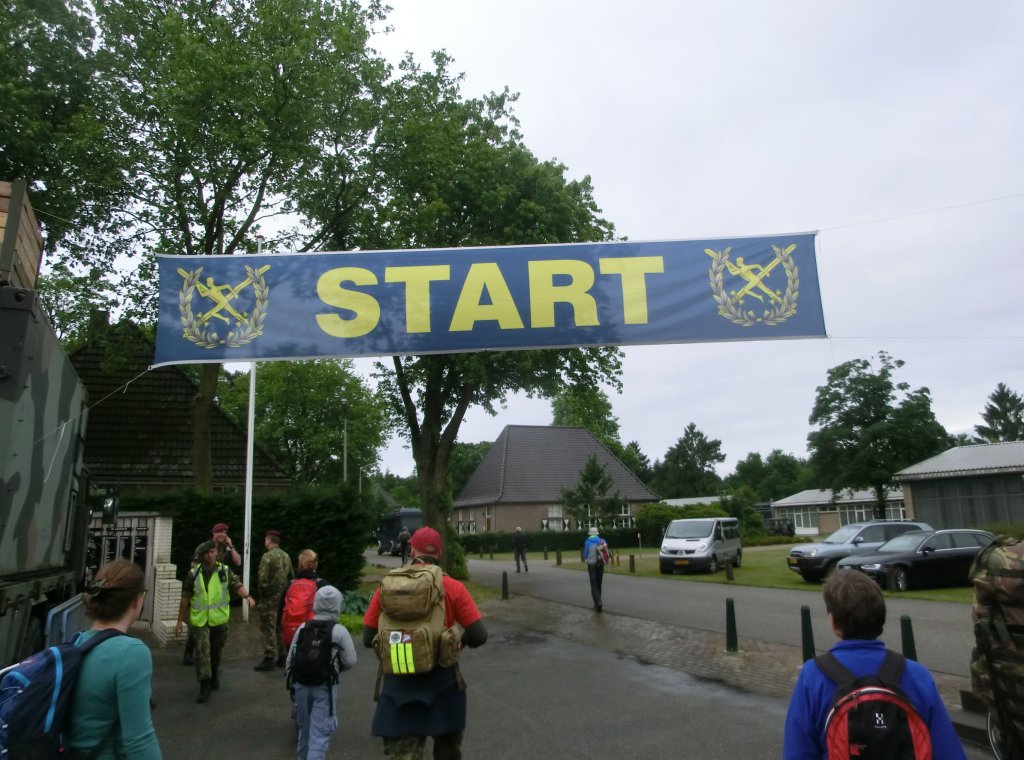 Karakter, een leuk ingericht gezellig restaurant met leuke muziek. Het eten was heerlijk, als voorgerecht had ik zalmtartaar op geroosterde ciabatta en Aat gamba’s met knoflook. Als hoofdgerecht hadden we beiden Black Angus sukade, geserveerd op een andijviestamppotje. Een toetje kon er echt niet meer bij, na een kopje thee/koffie hebben we nog een rondje gelopen en eenmaal op de hotelkamer hebben we nog even tv gekeken. De volgende ochtend zaten we al om 7 uur aan het ontbijt en na het uitchecken hebben we onze bagage in een kluisje op het station gestald. Dat was in feite heel makkelijk maar door ons geklungel duurde het toch wat langer. We zullen het er maar op houden dat we nog niet helemaal uitgeslapen waren. Aan de achterzijde van het station was een vlag geplaatst van de Falcon walk en er reed een busje heen en weer om de wandelaars bij de start te brengen. Deze was in Schaarsbergen bij de kazerne van de Luchtmobiele Brigade.