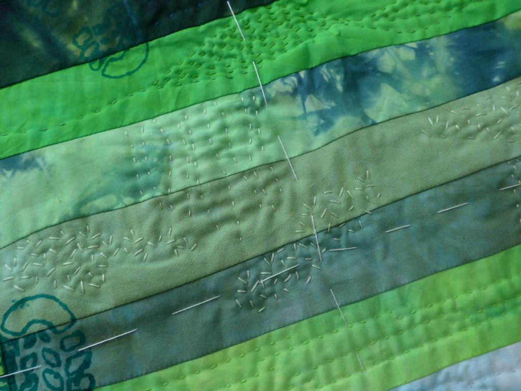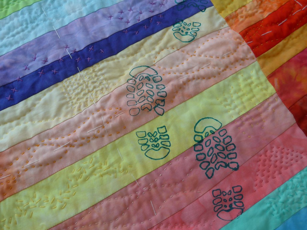 Het lijkt wel of ik tegenwoordig alleen maar wandel en niet meer quilt, toch valt dat wel mee. Ik heb mijn twee grootste hobby’s samengevoegd in een wandelquiltje. Voordat ik op vakantie ging heb ik het quiltje machinaal in elkaar gezet en tijdens de vakantie ben ik begonnen met het doorstikken met de hand. Het is de bedoeling om dit quiltje op te spannen zodat ik daar al onze medailles en linten aan kan hangen. Met behulp van een thermofax screen heb ik de voetstappen erop gezet. Hier wat details.