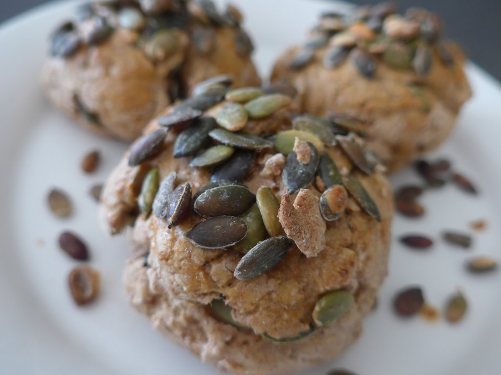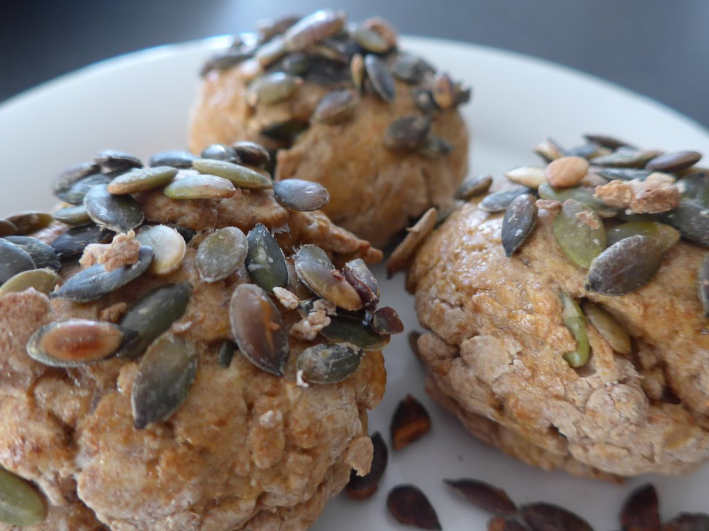 een halve flespompoen (ongeveer 450 gram), 265 gram speltmeel of tarwemeel of een combinatie, 200 gram speltbloem of tarwebloem, 50 gram pompoenpitten + wat extra om te bestrooien, 1,5 eetlepel kaneel, 9 gram wijnsteenbakpoeder, snufje zout, 100 milliliter melk, 2 eetlepels honing, 1 ei.